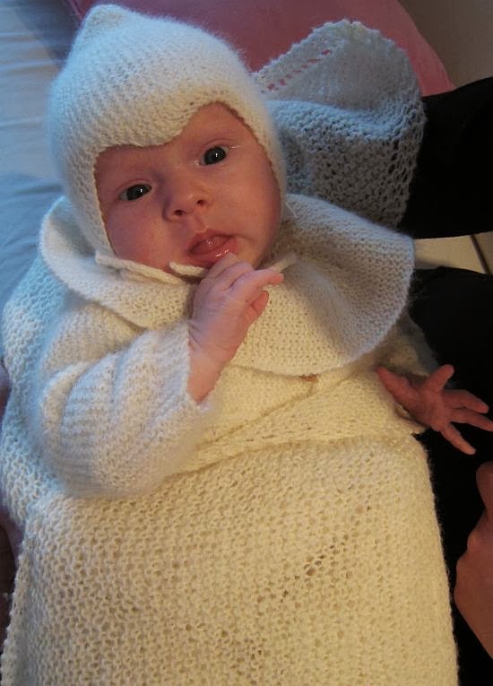 Miemora mi i sett fra Nøstebarn strikket i angora ull . Djevellue, siklesmekke, gammeldags vendejakke og Mor Signe teppe